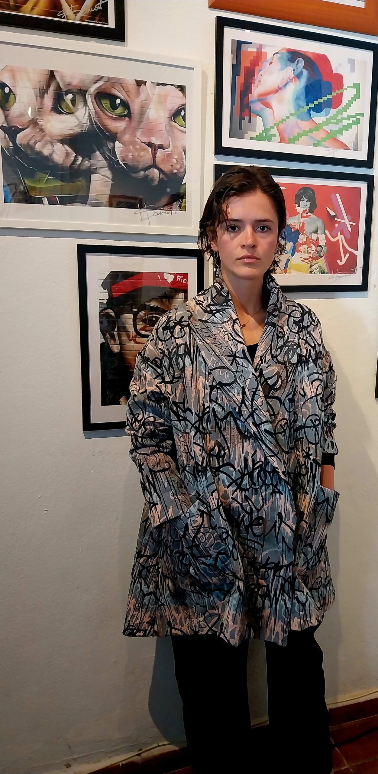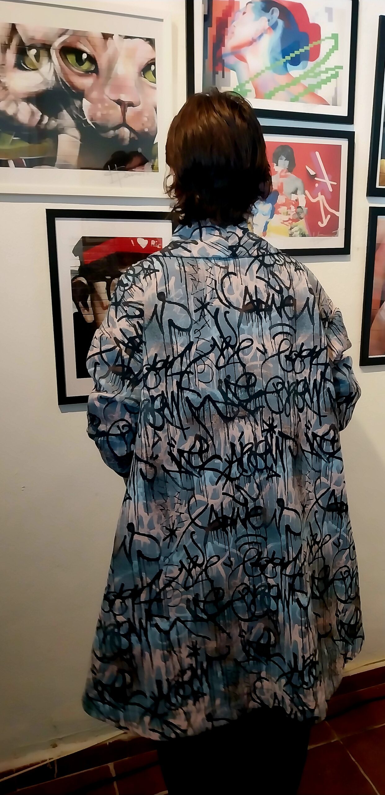 Abrigo con estampado abstracto en tonalidades grises, y azules con pinceladas negras. Ideal para un look vanguradista. De tejido ligero puedes llevarlo tambien los dias de primvera