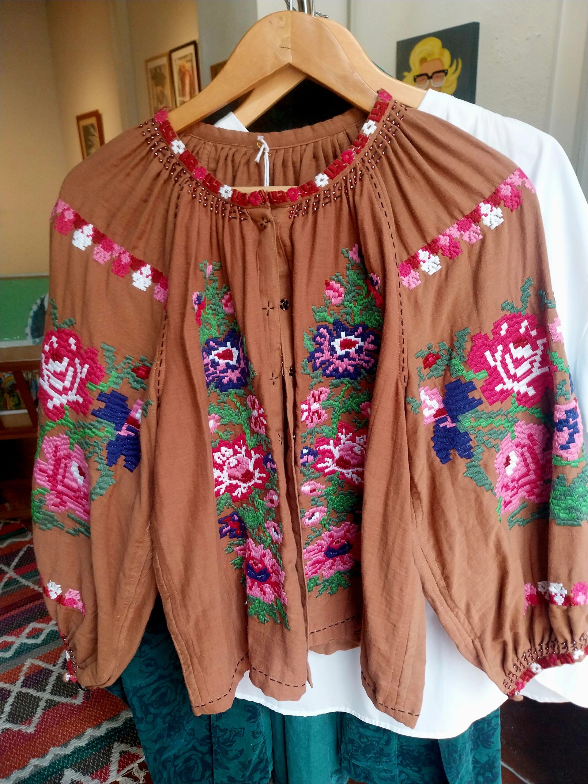 CAMISA india con bordados en flores con tonos rosaa, rojo, verde… con rizo en el cuelloy las mangas.