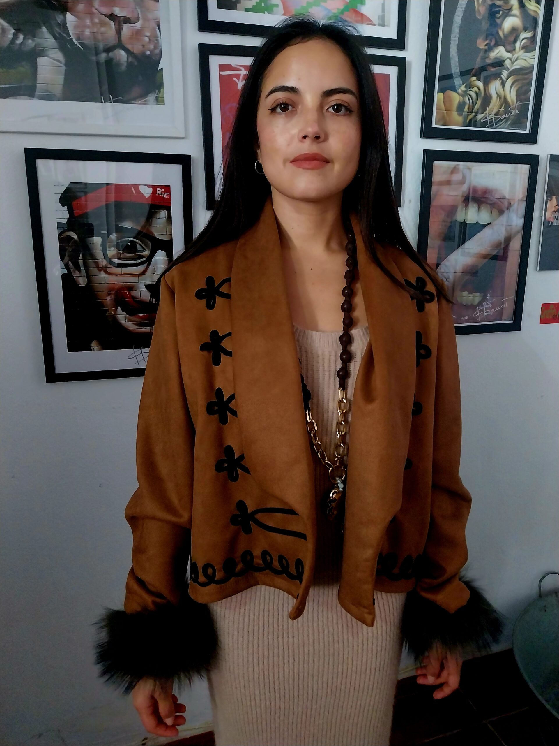 Cazadora en ane marron ribeteada con dibjos negros.