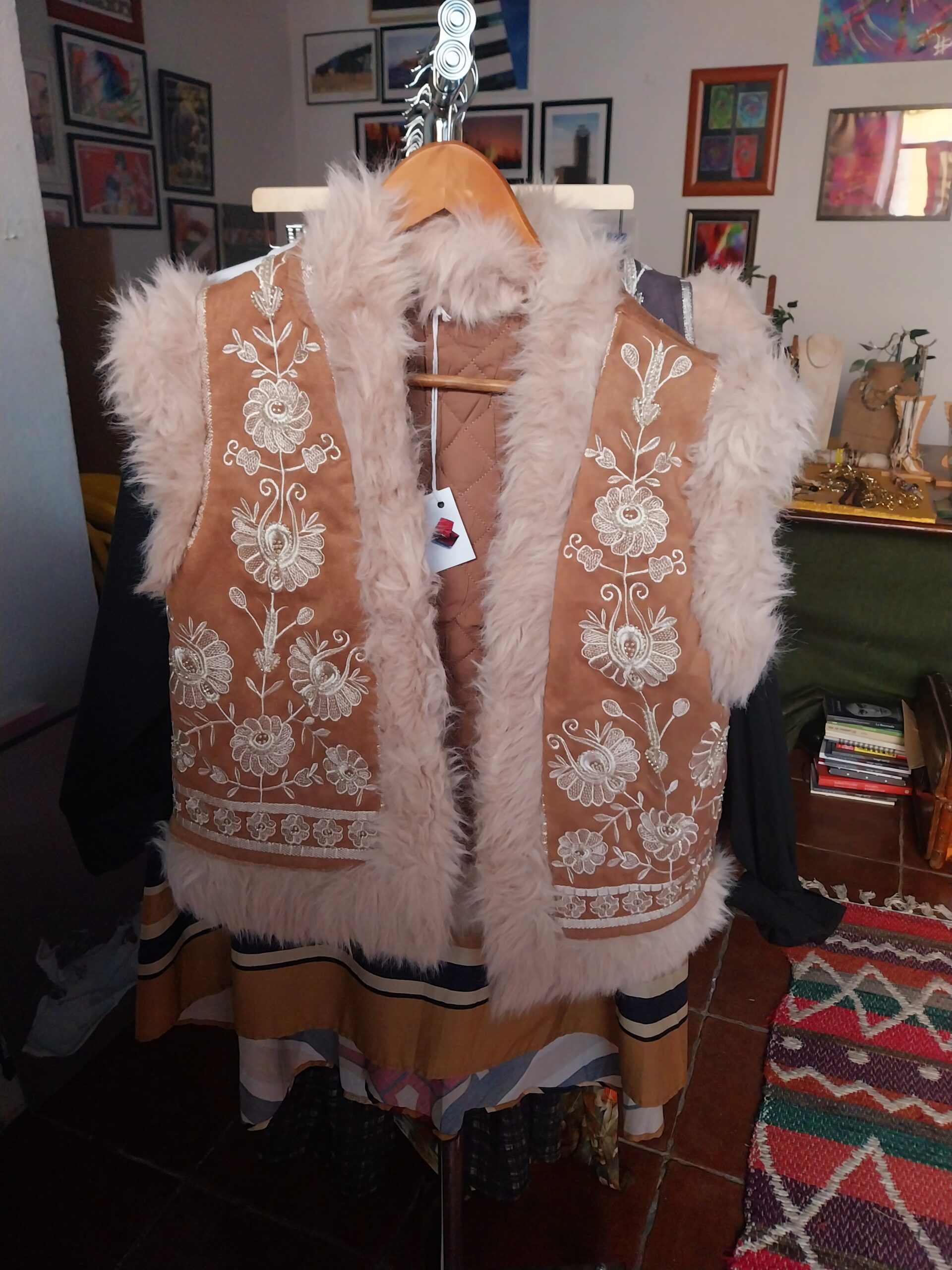 Chaleco beige con flores blancas bordadas y ribeteado en pelo.