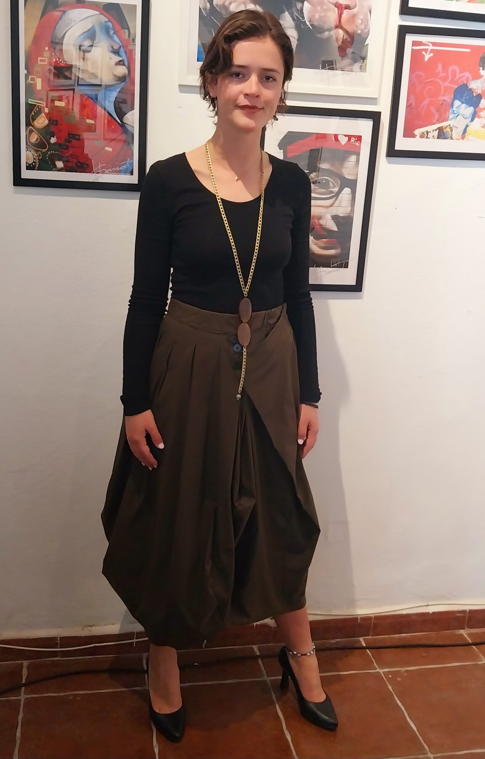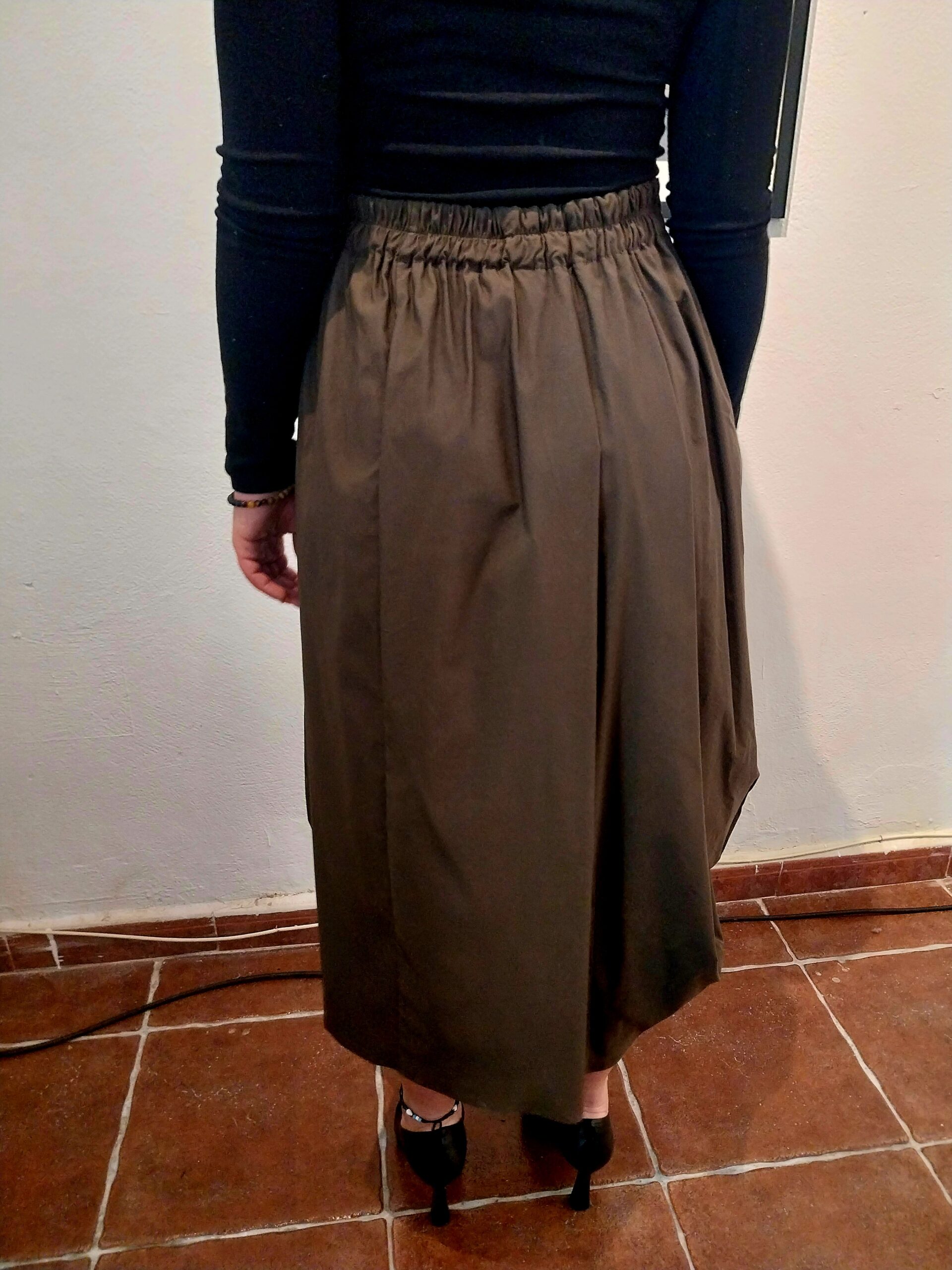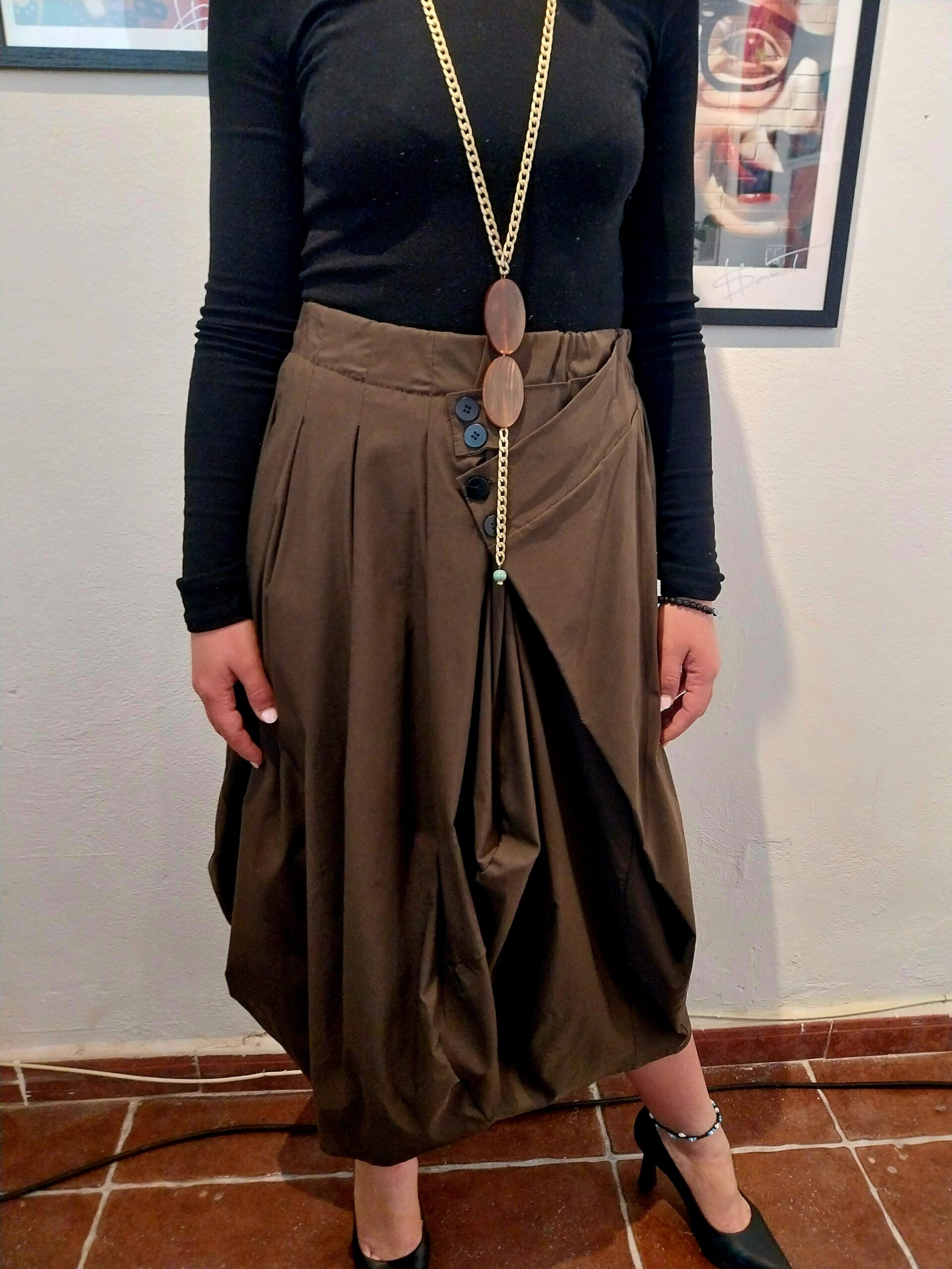 Imagina una falda marron que combina la elegancia del marron con la libertad de un diseño desestructurado. Falda color chocolate con un corte irregular y un largo que cae pr encima justo de la rodilla., con elastico ajustable.