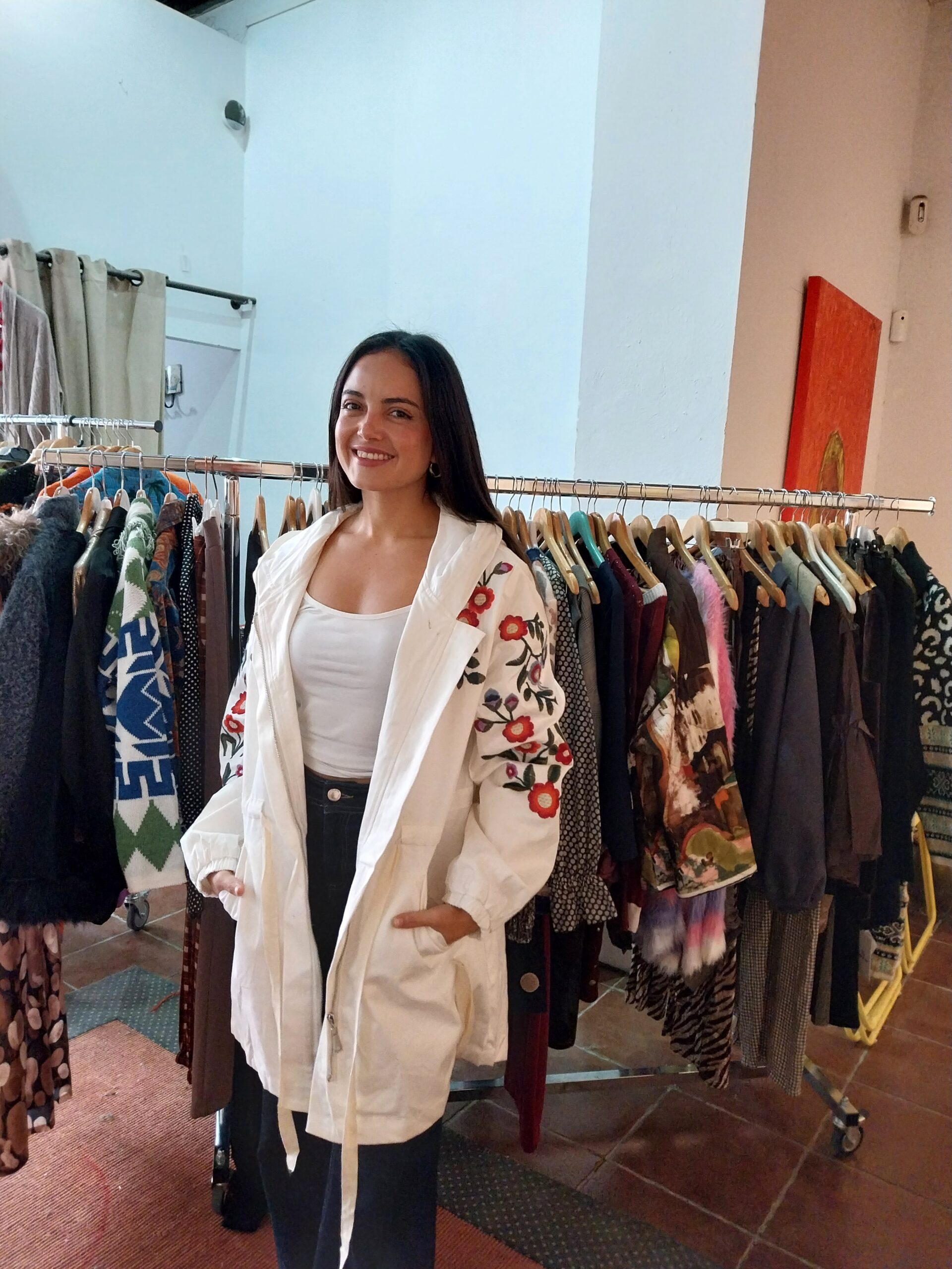Gabardina blanca con flores bordadas en rojo y verde. Muy original, y favorecedora .