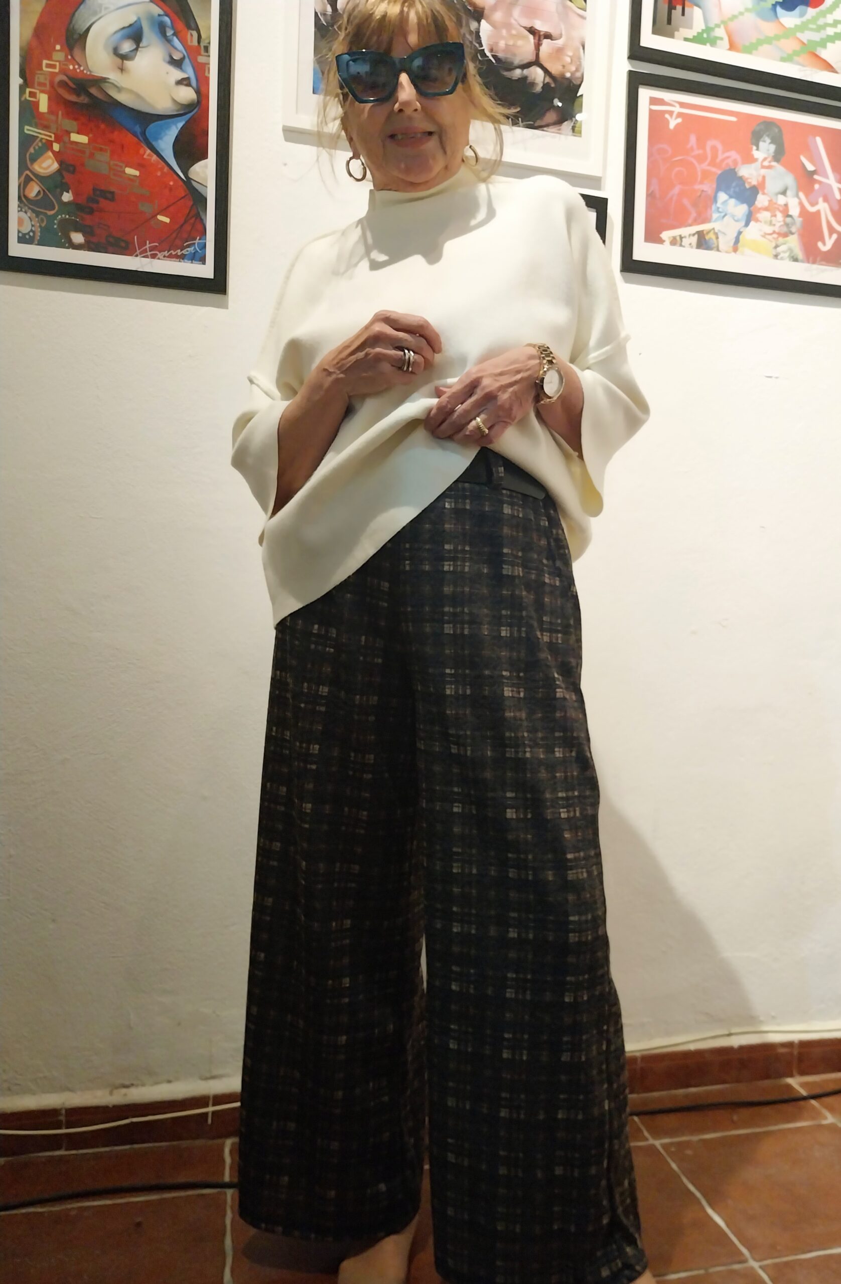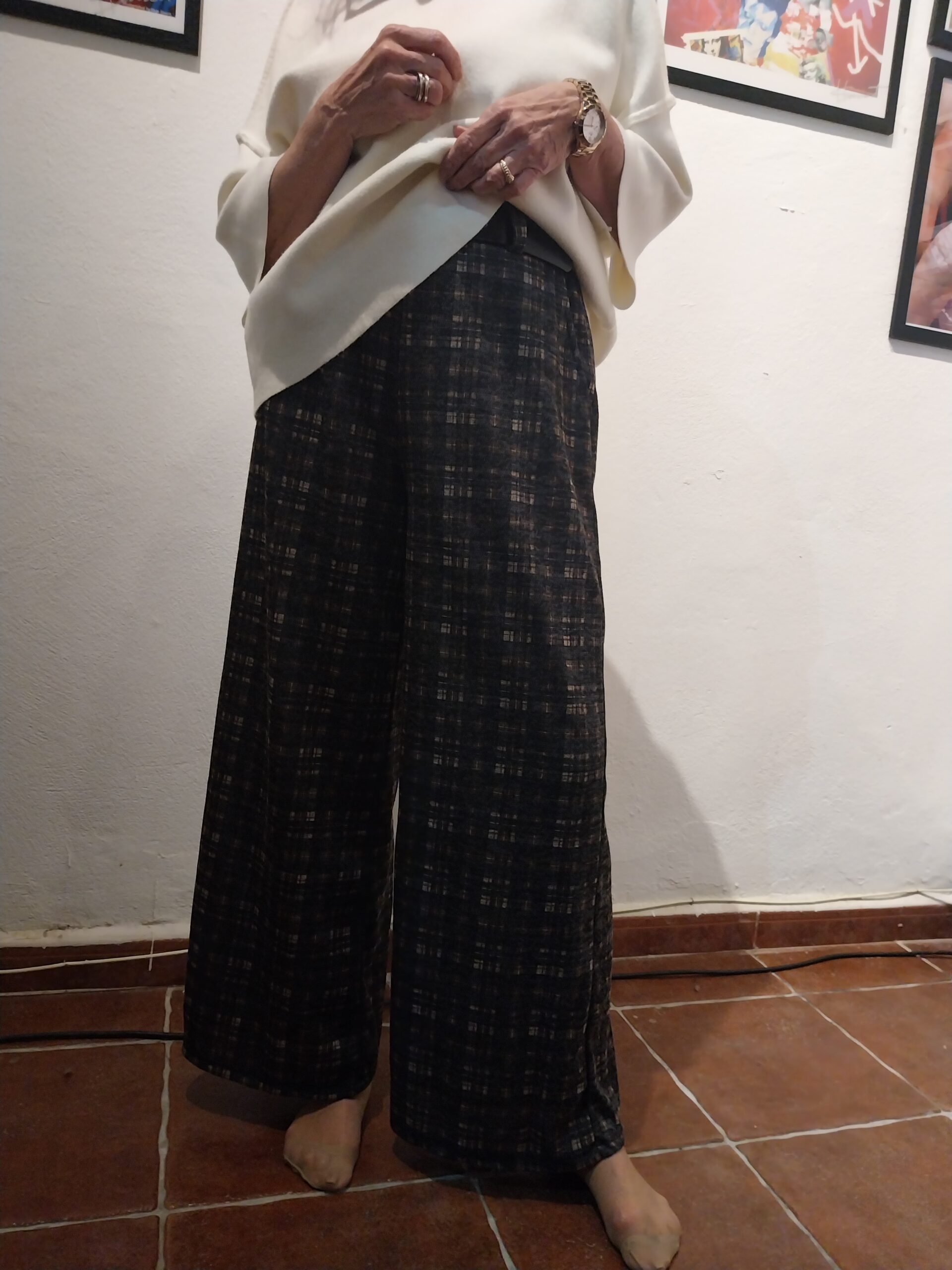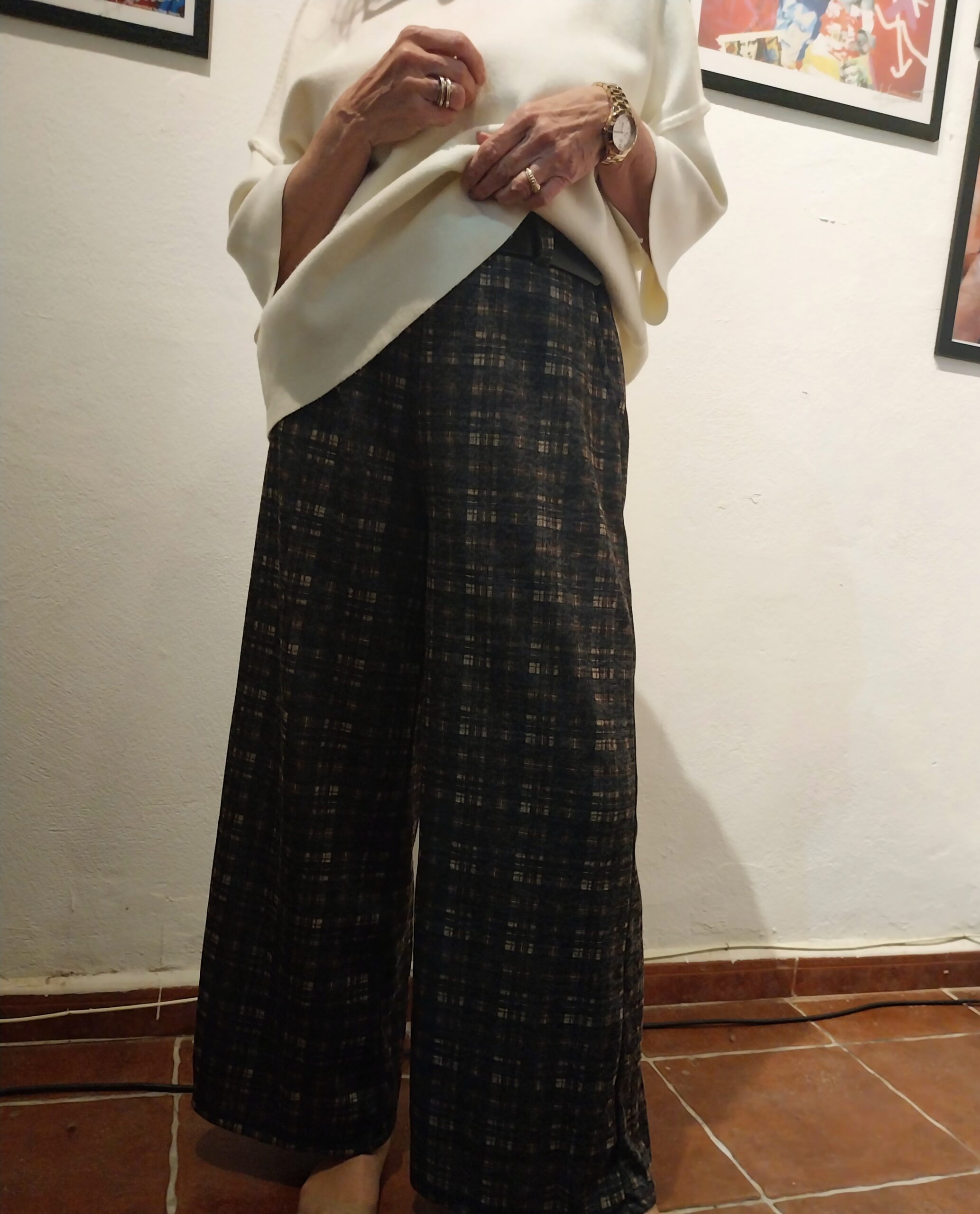 Pantalon de pinza en cuadros oscuros. Ideal para combinar con jersey beig o camisa blanca.