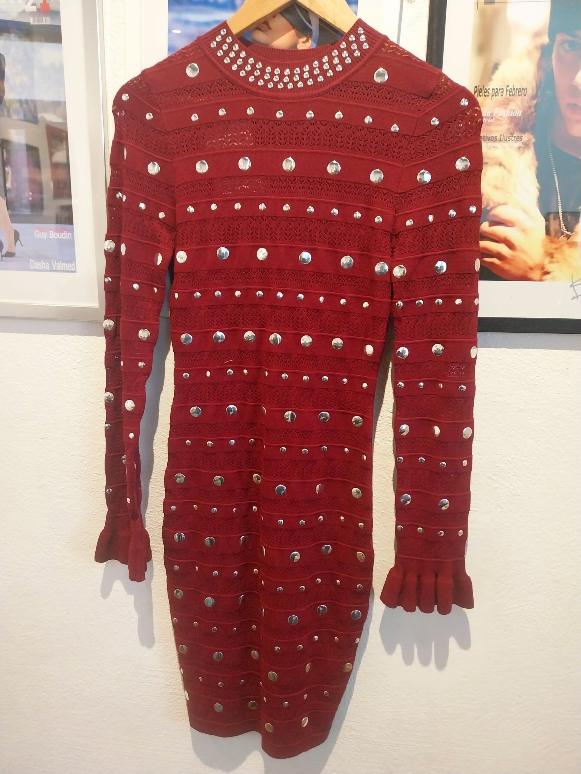 Traje cuello redondo color vino, con tachuelas metálicas con mangas largas con volante.