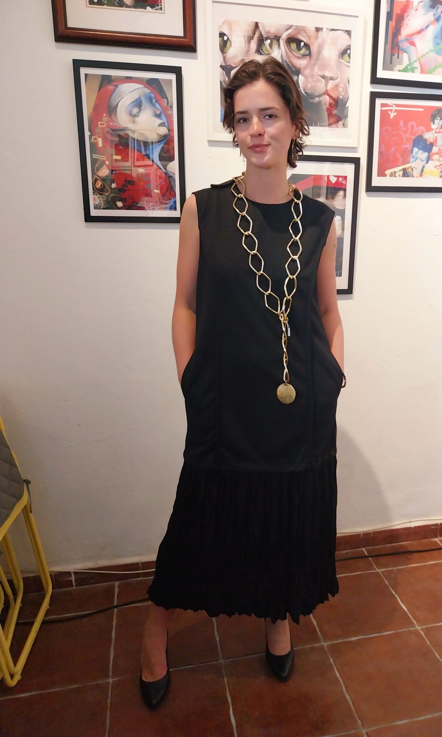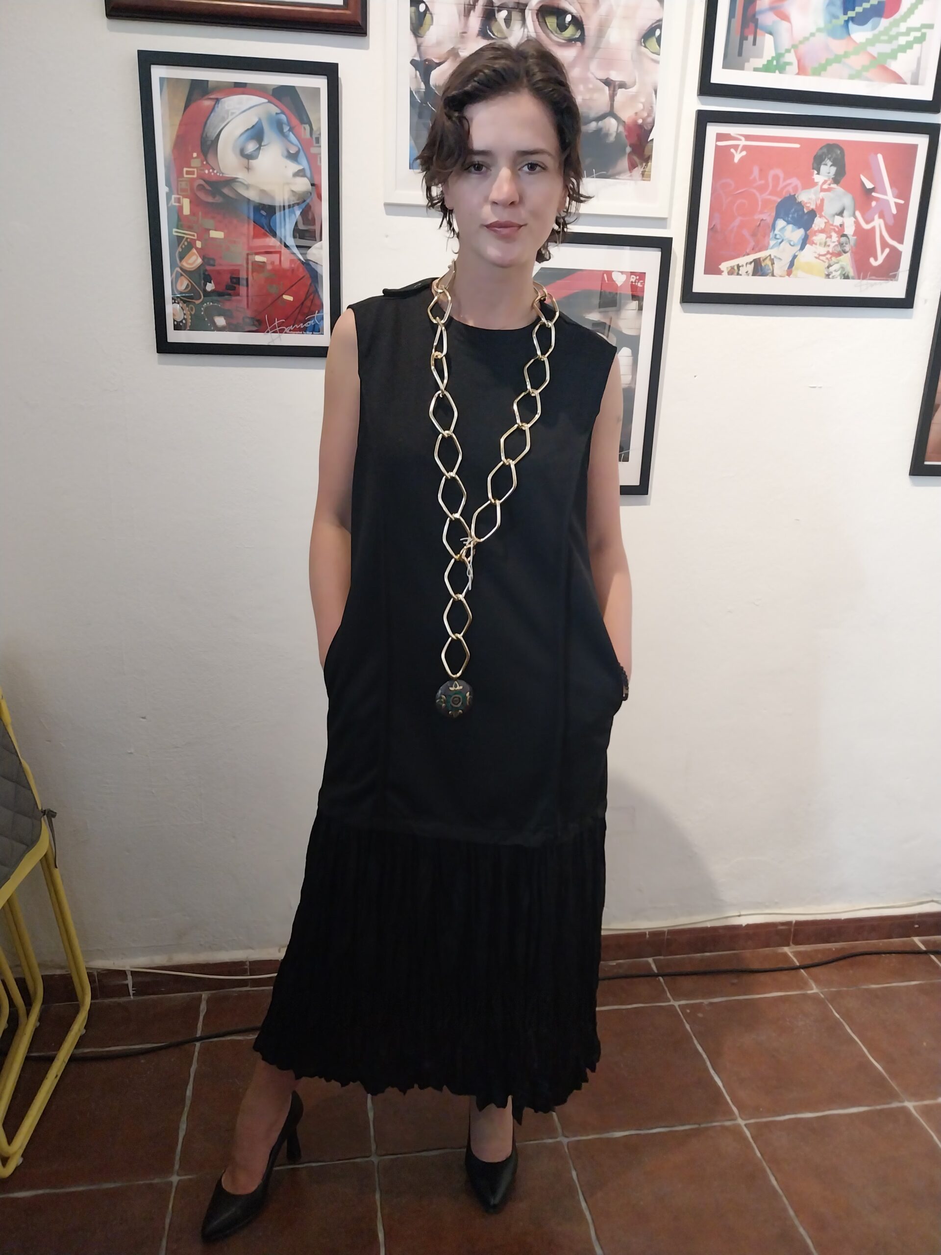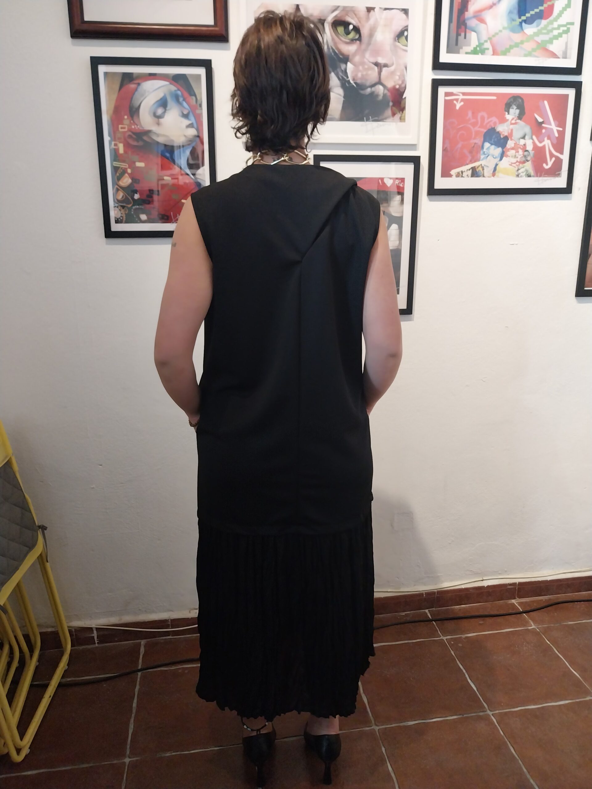 Vestdo negro recto con volante en raso al bajo. Ideal para fiesta que puedes combinar con accesorios. Tres chic. Un vestido negro imprenscindible en tu armario.